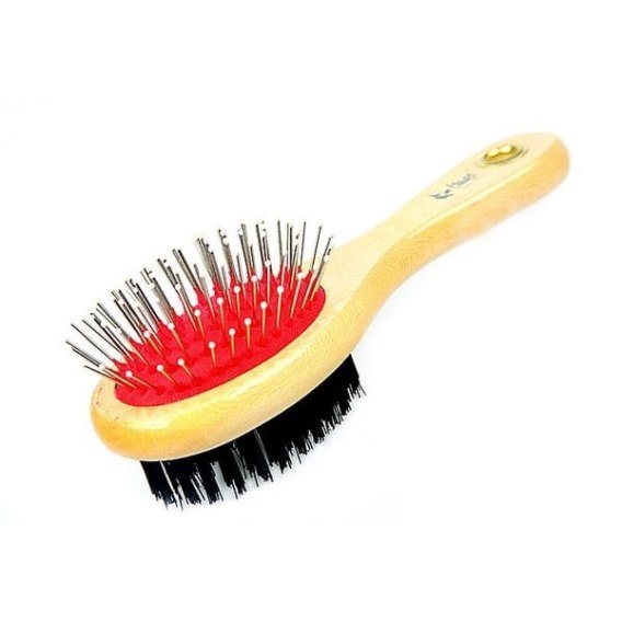 Dwustronna szczotka drewniana do wyczesywania i nadawania połysku sierści psa lub kota. Rozmiar L, długość całkowita 24cm.