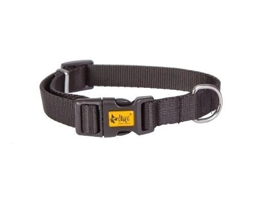 Regulowana obroża dla psa z taśmy, z plastikowym zapięciem w kolorze czarnym. Długość 45cm.
