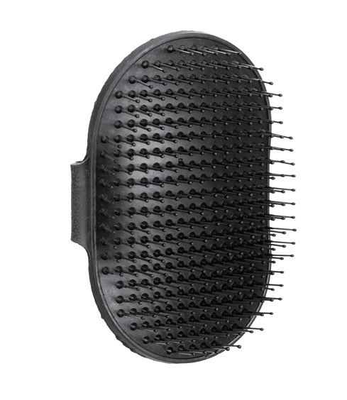 Szczotka jest także antypoślizgowa i wygodnie leży w dłoni, a dzięki ergonomicznemu kształtowi pozwala wyczesywać psa całą dłonią i pewnymi ruchami. Samo zgrzebło wykonano z metalowych szpilek, na których końcach znajdują się zabezpieczenia w formie plastikowych kulek. Dzięki temu skóra psa nie jest podrażniania w trakcie pielęgnacji, a samo czesanie stanowi dla psa przyjemny masaż.